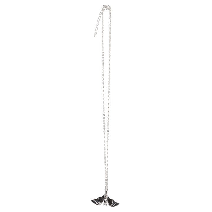 The intricately designed bat dangles from a stainless steel chained necklace. Presented on a matching backing card.