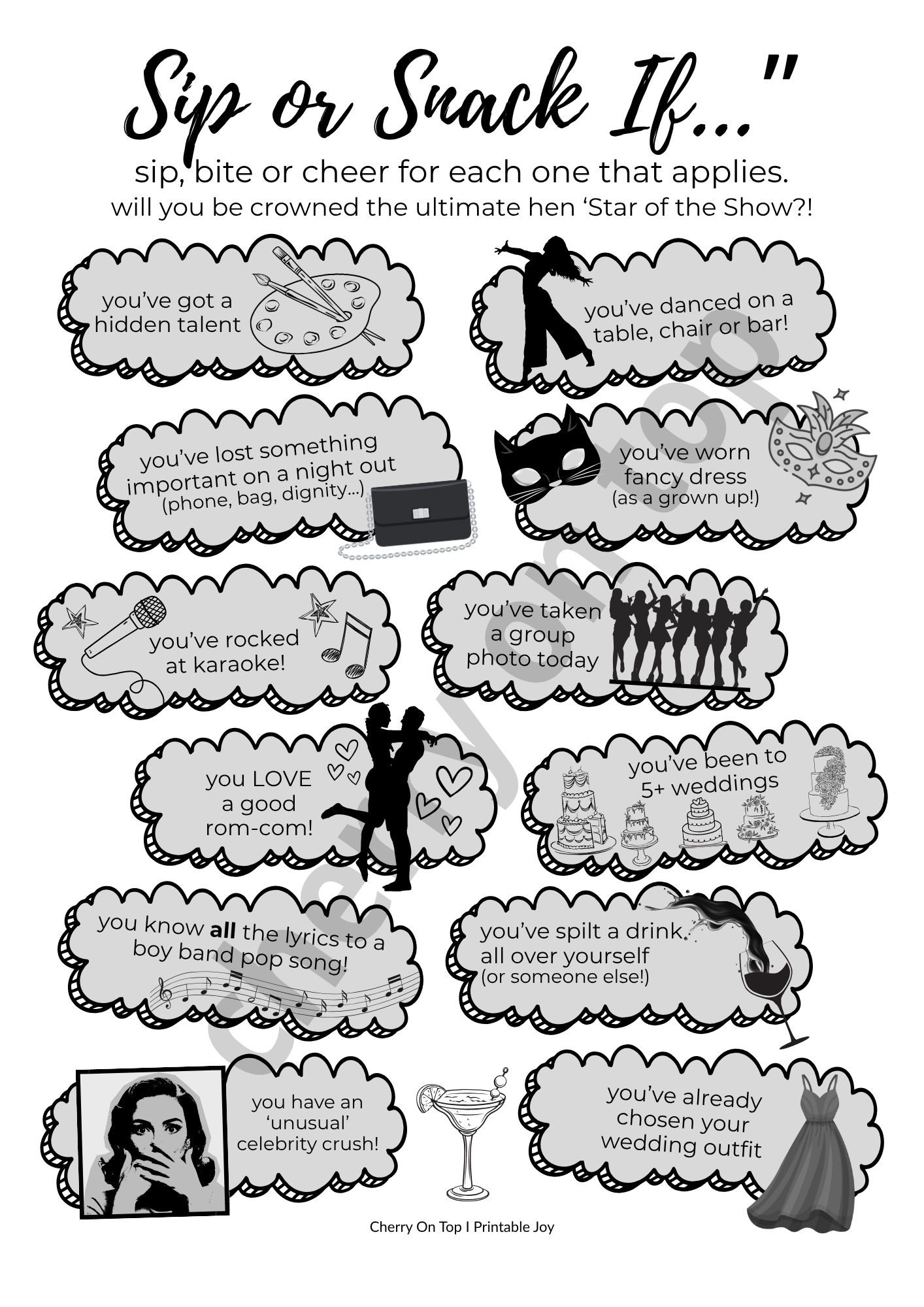 Why choose when you can have it all?! The Ultimate Hen Party Shenanigans Bundle brings together both our Classy and Cheeky Editions, PLUS our bonus Snack If... and Sip or Snack If... games - every printable game, every vibe, all in one beautiful collection.